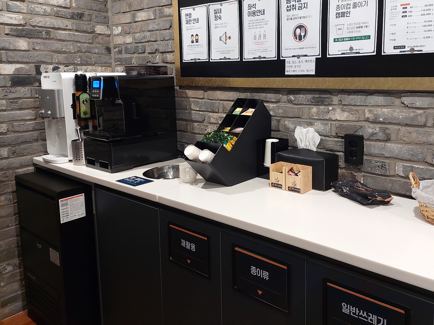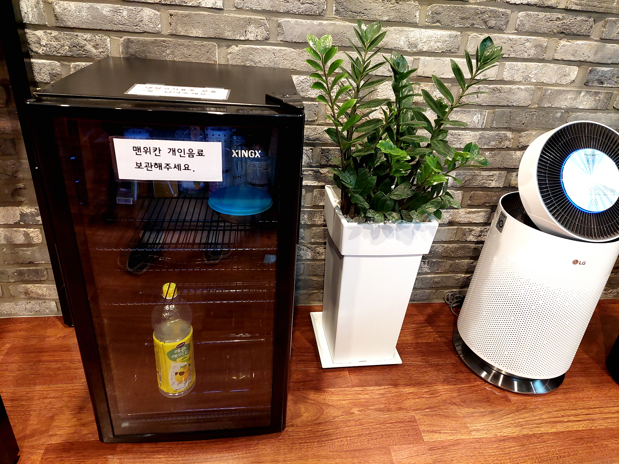 정수기와 원두 머신, 믹스커피, 티백차는 무료 이용이 가능했고, 개인 음료도 냉장고에 같이 보관이 가능했다.