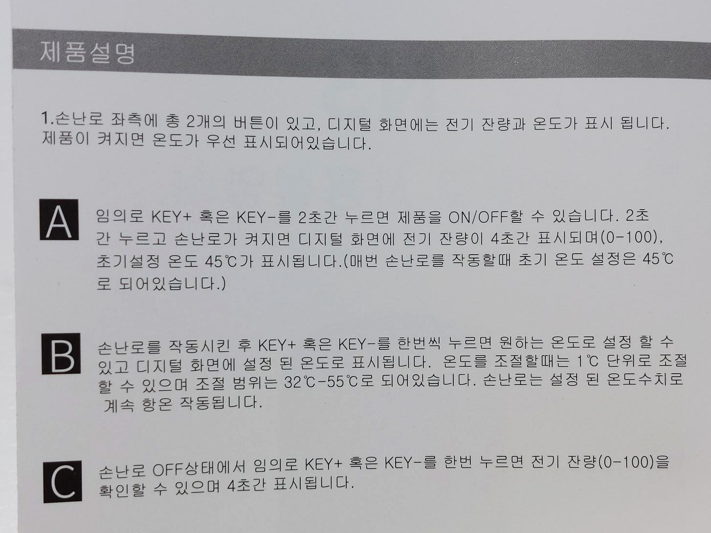 32~55도까지 사용이 가능하고, 손난로 온도는 65도가 넘으면 기기가 자동으로 꺼진다고 한다.